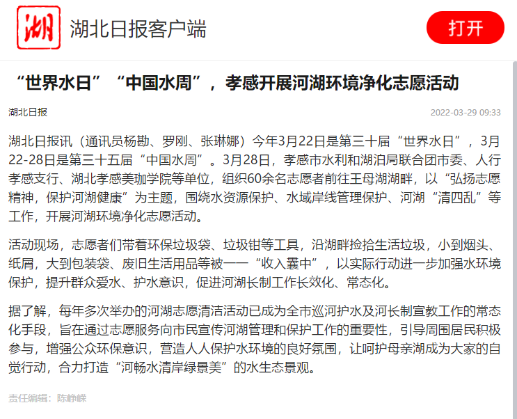 此次活动进一步增强了青年志愿者们保护环境、珍惜水资源的意识。保护河湖生态环境是一件需要长期坚持的事情,希望通过此次活动号召更多的学生志愿者加入进来,并且带动周围的人,共同关注环境保护,树立生态环保意识,为保护河湖生态环境贡献自己的力量。