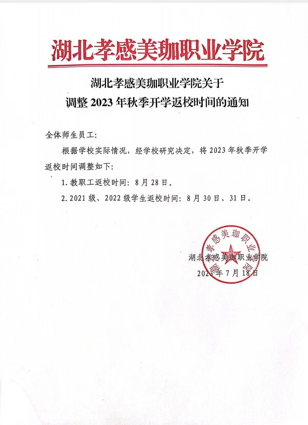 湖北孝感美珈职业学院关于调整2023年秋季开学返校时间的通知
