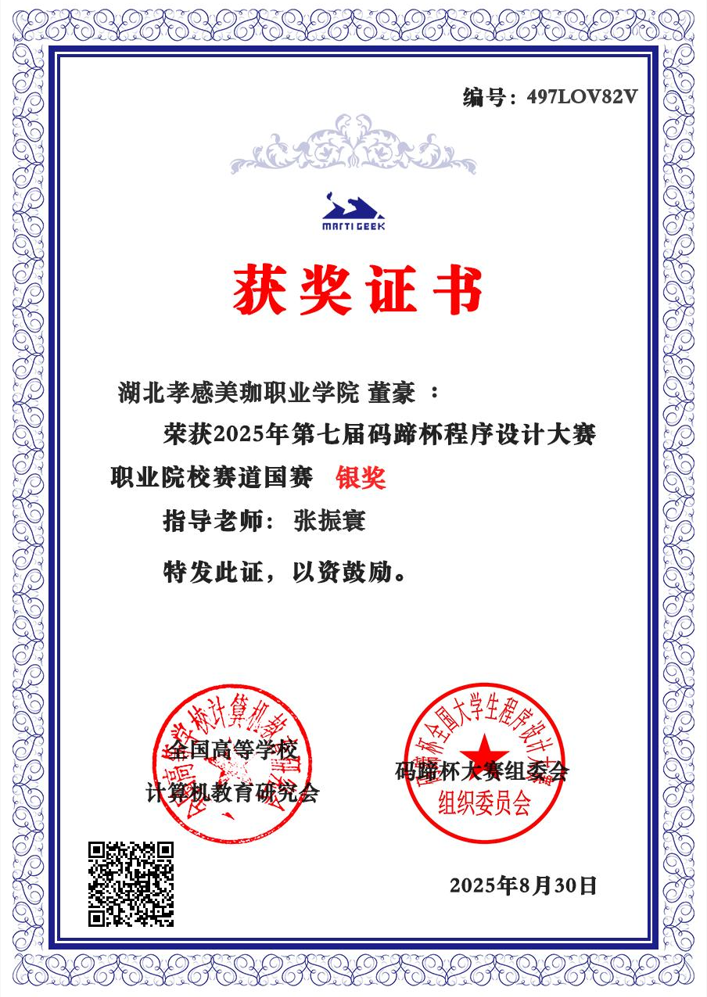 在2025年“码蹄杯”全国大学生程序设计大赛国赛中,信息技术学院再传捷报——软件2301班董豪同学斩获国赛二等奖,软件2402班刘宵豪同学荣获国赛优秀奖,在全国顶尖选手的激烈比拼中脱颖而出,展现了信息技术学院学子扎实的专业功底与昂扬的竞技风采。