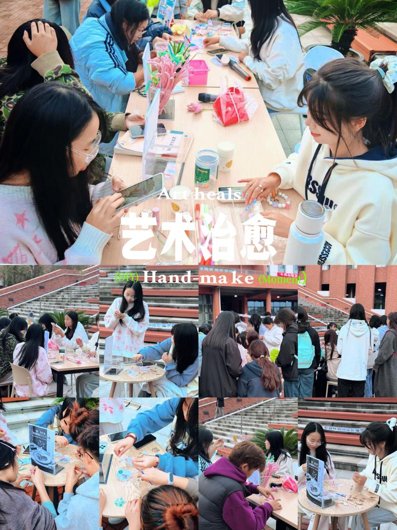 而作为一片宁静的港湾,“艺术疗愈”手工制作区则为同学们提供了截然不同的体验。 在这里,同学们可以自由选择手工串珠子、发夹DIY、手工扭扭棒等创作活动。这个静谧的空间让同学们在专注的手工过程中静心创作、放松身心,于艺术之美中感受内心的宁静与满足。