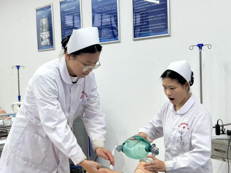 淬炼之路道阻且长,却因各方支持倍感温暖。备赛期间,医事科技学院院领导全程跟踪进展,辅导员老师时刻关注选手思想动态,专职教师团队倾囊相授,与参赛师生并肩作战。暑气蒸腾的假期,徐紫涵、熊忆文放弃休憩,在校园里刻苦训练,深夜的实训室灯光见证着她们的坚守。网课学习、刷题记笔记、反复打磨操作,国庆后新增的 CPR + 除颤、静脉输液等项目挑战重重 ——CPR 按压的毫米精准、频率把控,心电监护导线的规范缠绕,双人配合的节奏衔接,每一个细节都经过千百次锤炼。手腕红肿、磨出水泡、手臂抬不起来是常态,但想到学校的期盼、领导的嘱托与老师的陪伴,她们始终咬牙坚持。