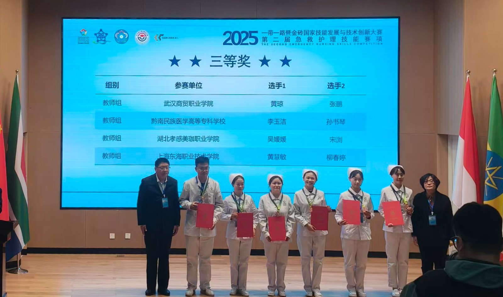 11月10日至14日,2025 年“一带一路”暨金砖国家技能发展与技术创新大赛第二届急救护理技能赛项圆满落幕。我校医事科技学院师生奋勇拼搏,从全国众多参赛队伍中脱颖而出,一举斩获两个三等奖,用专业与坚守在国家级赛场绽放美珈风采。